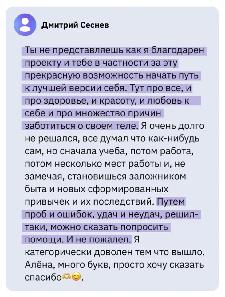 С нами худеют, скидывают балласт с боков, набирают мышечную массу, учатся жить в комфортном весе и % жира и есть полезно, не исключая вкусного.